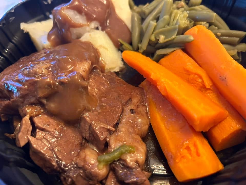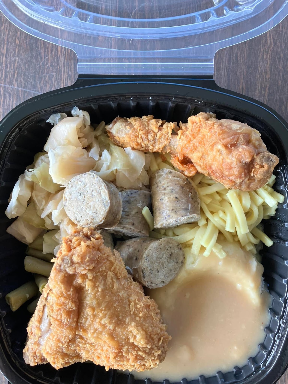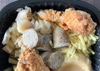 Broasted Chicken, Polish Sausage, Mashed Potatoes and gravy, Kluski Noodles, Green Beans, Sweet and Sour Cabbage, roll and butter cookie. Broasted Chicken, Polish Sausage, Mashed Potatoes and gravy, Kluski Noodles, Green Beans, Sweet and Sour Cabbage, roll and butter cookie.