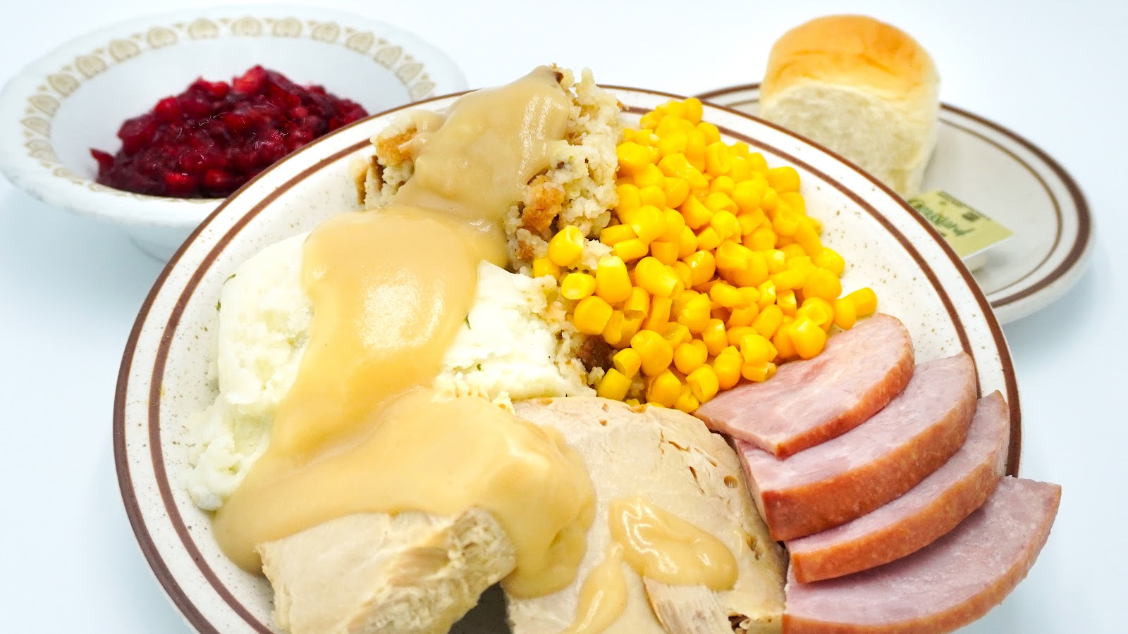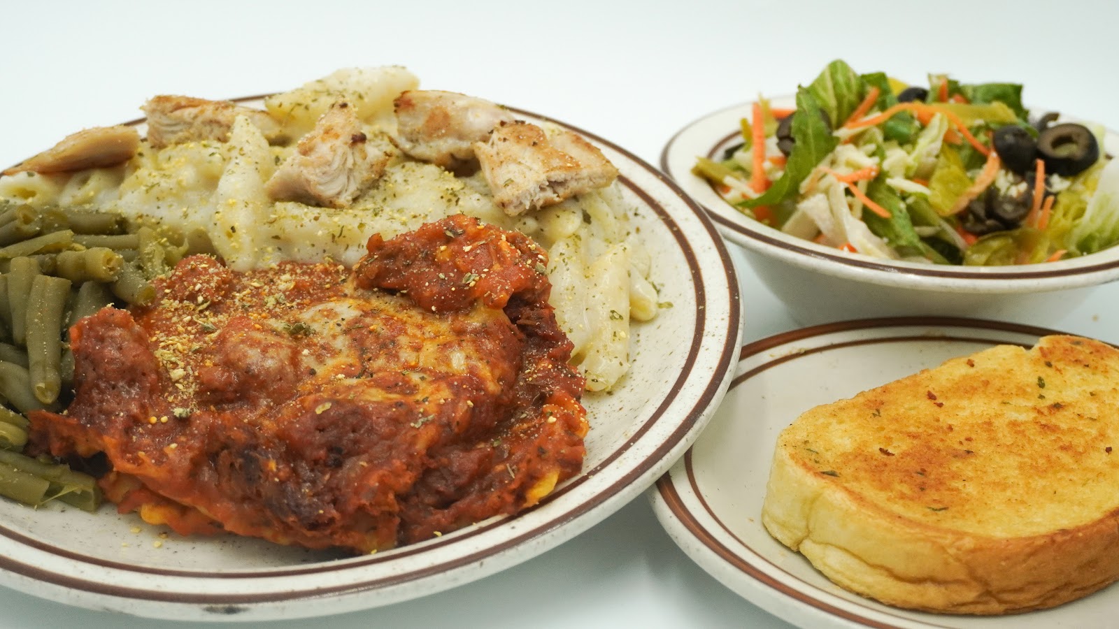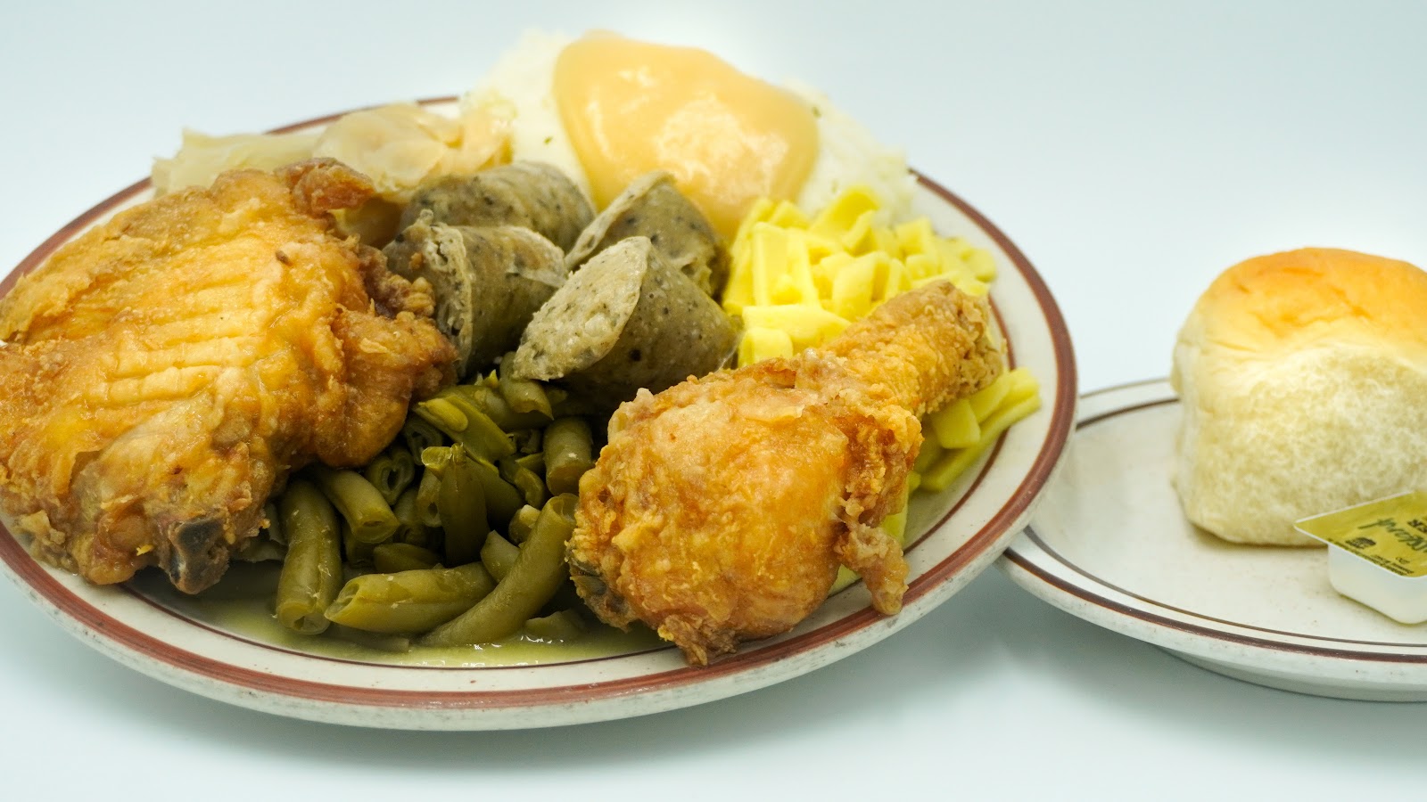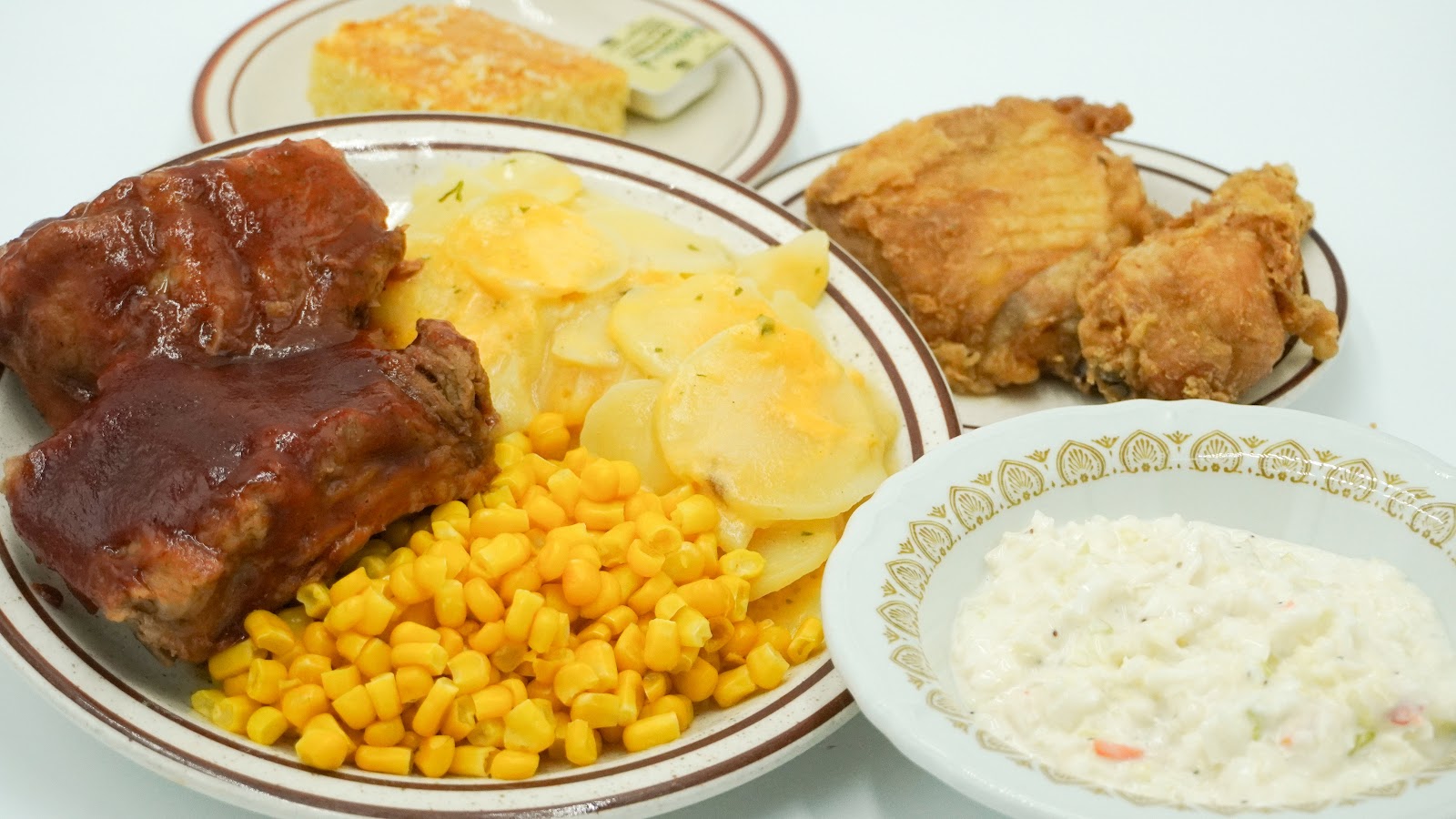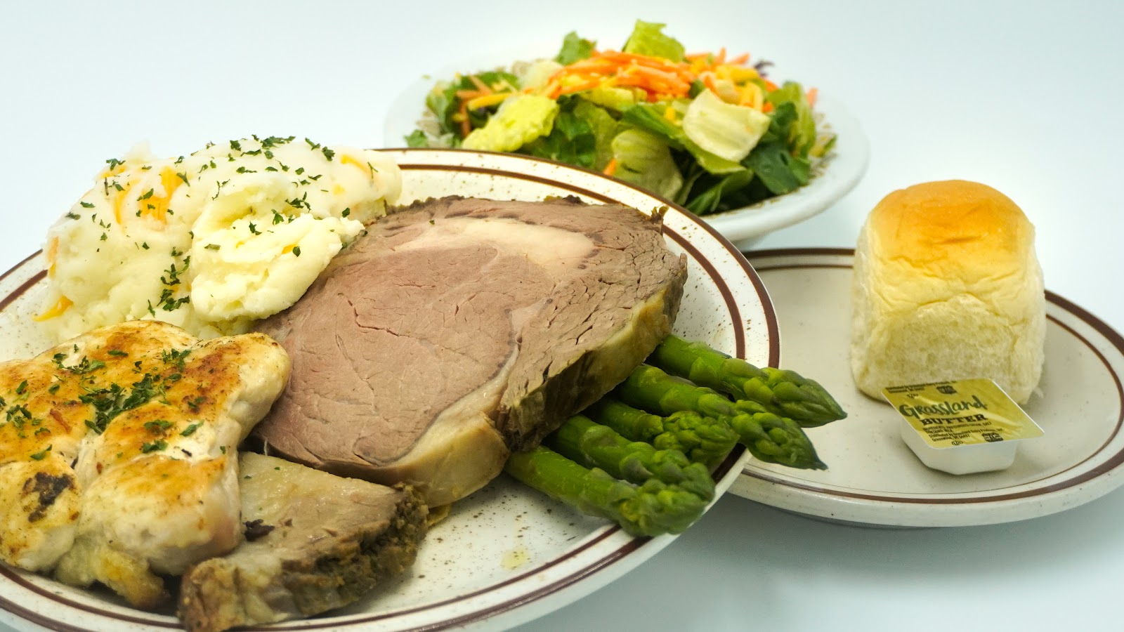 Prime Rib, Seasoned Chicken breast. Steamed asparagus, mashed potatoes. A house made salad and a soft roll with butter. Stuffed Chicken breast. Top round roast. Seasoned Potatoes, steamed baby carrots. House salad and a soft roll with butter. Cheesy lasagna with greenbeans. Chicken Alfredo. Antipasto salad, and toasted garlic bread. Two BBQ Ribs. Two pieces of friend Chicken. Golden corn. Cheesy Potato Casserole. Creamy Coleslaw, and house made cornbread with butter. (Skillet Recipe) Polish Sausage. Klusky noodles. Mashed potatoes and country gravy. Sweet and sour cabbage. Green beans, and a soft roll with butter. Honey Baked ham. Tender baked Turkey. Mashed potatoes and country gravy. Sage dressing. Country style corn. Cranberry Apple Relish, and a soft roll with butter.