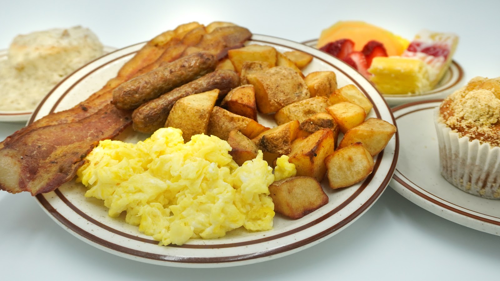Scrambled eggs, bacon, friend potatoes, fresh fruit and a pastry. A muffin and Biscuits and gravy.
